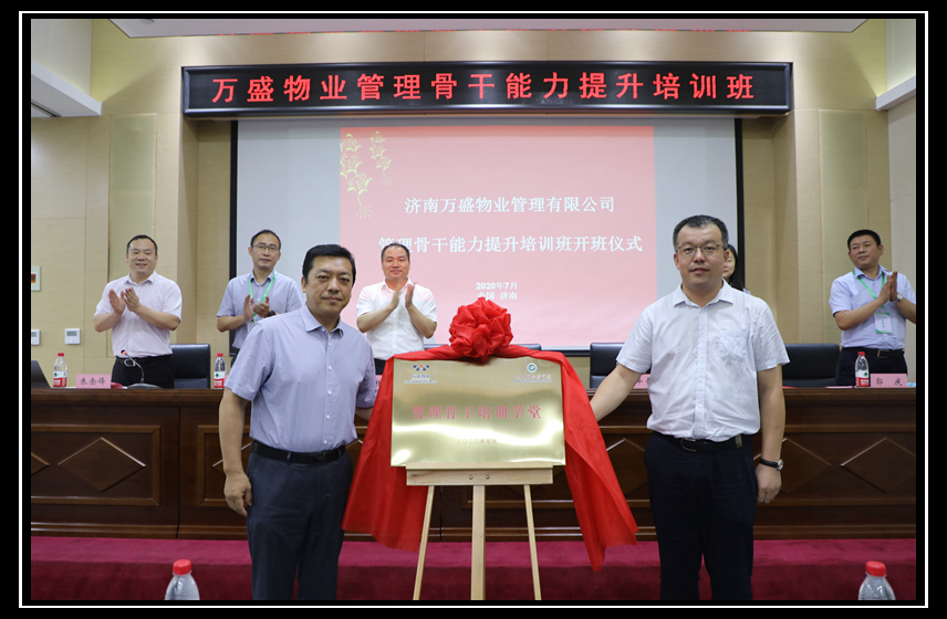 隨后,集團公司副總經(jīng)理、地產(chǎn)公司總經(jīng)理徐洪濤和山青學院對外合作辦公室主任牟晉京共同為濟南萬盛物業(yè)管理骨干培訓學堂揭牌。
