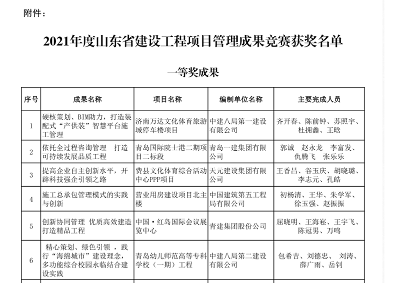 近日,2021年度山東省建設(shè)工程項(xiàng)目管理成果競(jìng)賽獲獎(jiǎng)名單公布,由四建地產(chǎn)牽頭申報(bào)的課題成果《創(chuàng)新管理 精細(xì)施工 打造高品質(zhì)住宅》榮獲一等獎(jiǎng)。